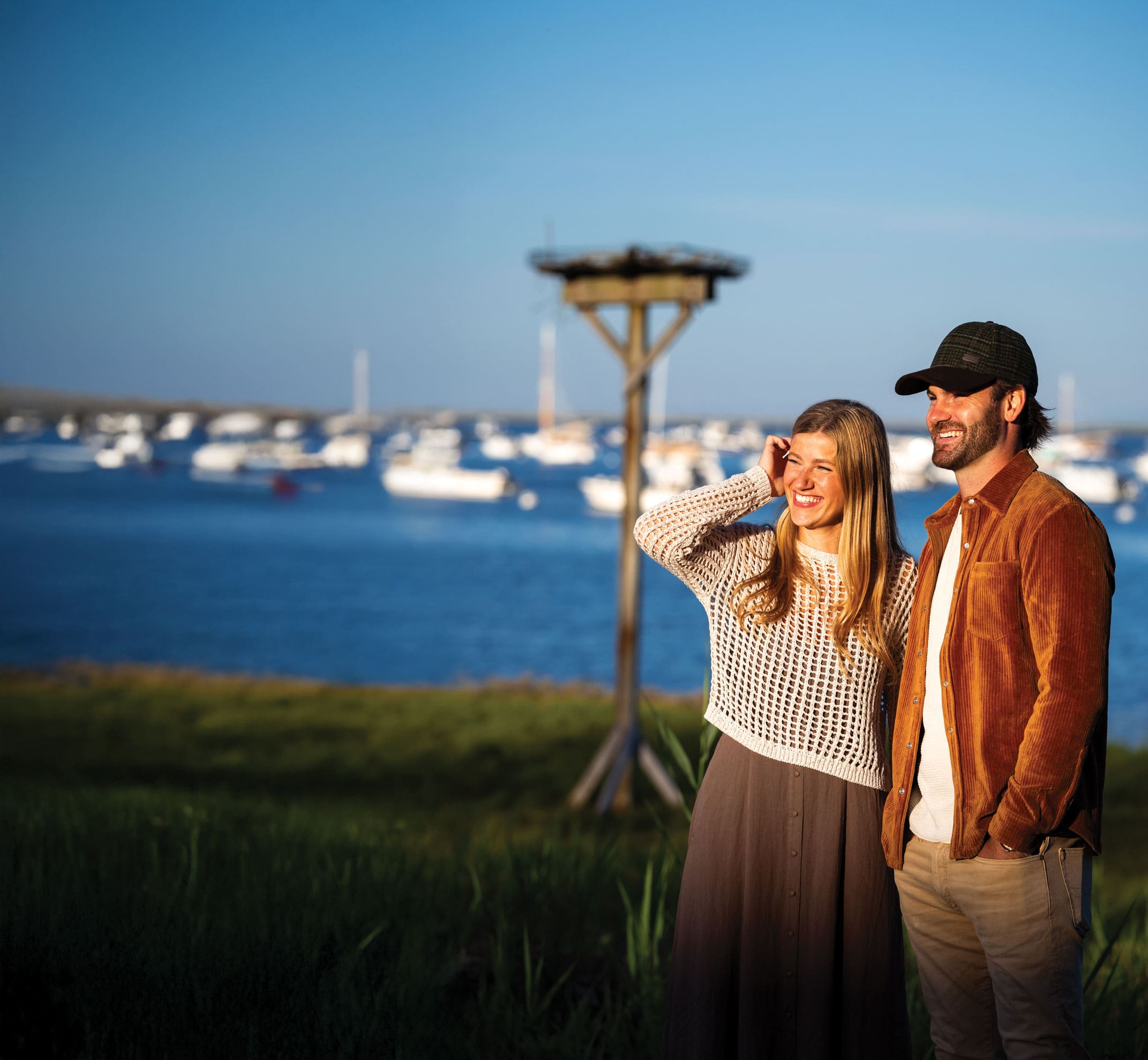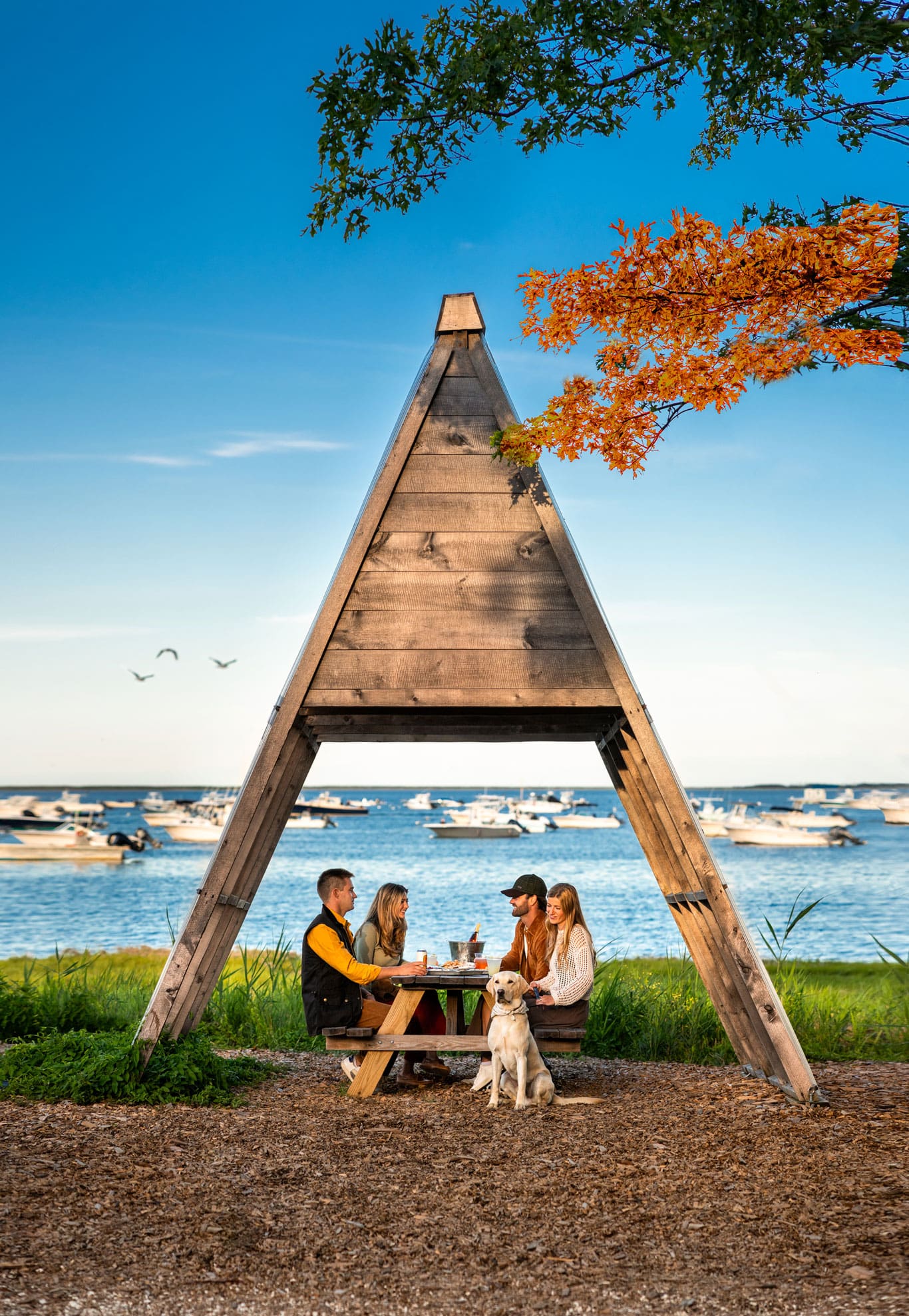 Boasting a laid-back atmosphere and a spectacular waterfront setting, the restaurant attracts a diverse clientele, from families with young children to stylish couples on date nights and groups of twenty-somethings who gather around picnic tables to toast the start of the weekend. Inside, the upstairs dining area glows warm against the twilight, offering a cozy perch with views of Duxbury Bay.