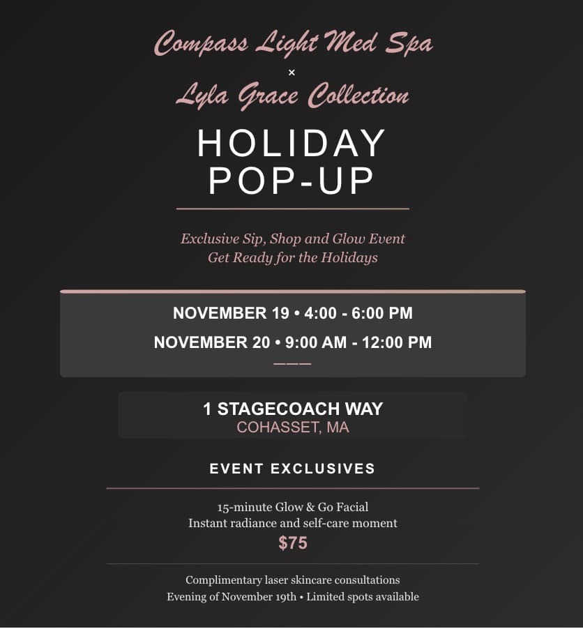 Exclusive Sip, Shop and Glow Event Get Ready for the Holidays NOVEMBER 19 • 4:00 – 6:00 PM NOVEMBER 20 • 9:00 AM – 12:00 PM 1 STAGECOACH WAY COHASSET, MA EVENT EXCLUSIVES 15-minute Glow & Go Facial Instant radiance and self-care moment $75 Complimentary laser skincare consultations Evening of November 19th • Limited spots … Read more