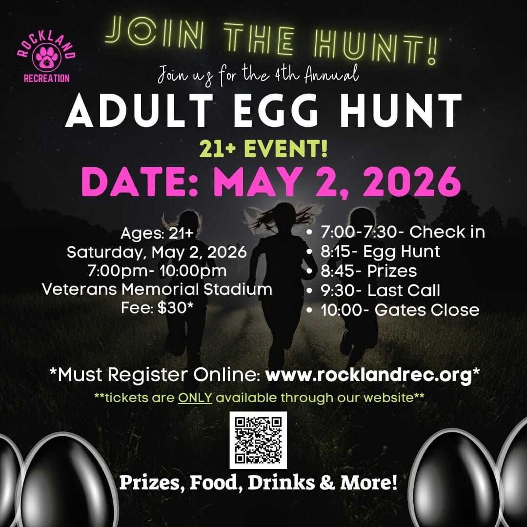 Join us for an ADULT ONLY Egg Hunt on Saturday, May 2nd from 7-10 PM! You must register to participate at www.rocklandrec.org.