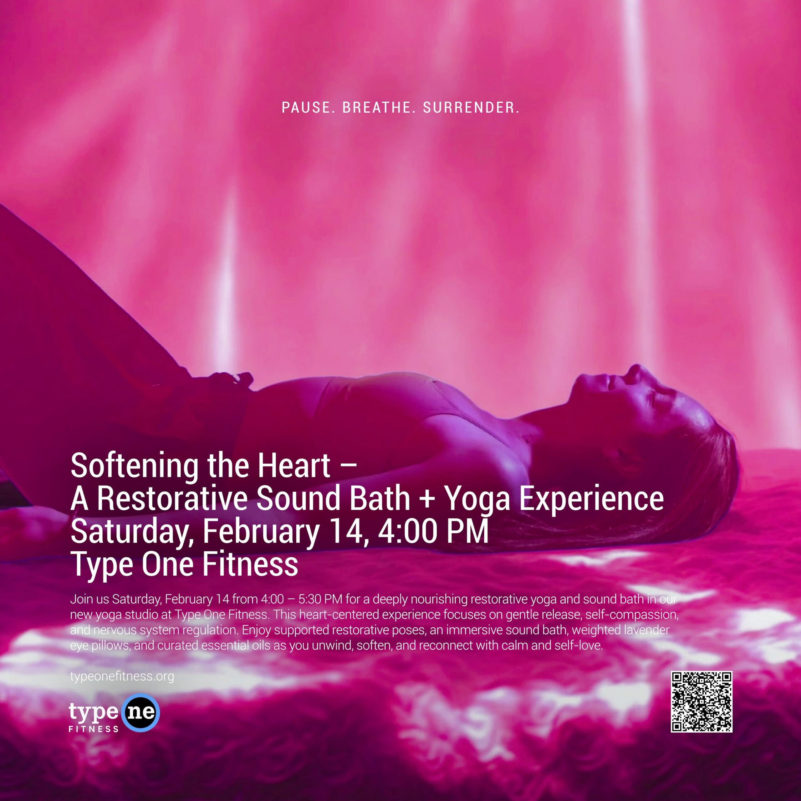 Pause. Breathe. Surrender. Join us Saturday, February 14 from 4:00 – 5:30 PM to indulge in a deeply nourishing restorative yoga and sound bath experience in our new dedicated yoga studio at Type One Fitness. This heart-centered evening focuses on softly opening and releasing, self-compassion, and nervous system regulation — loving on yourself. Enjoy supported ... Read more