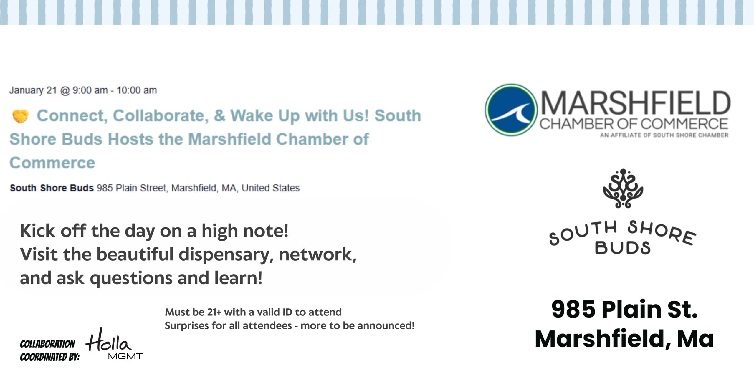 South Shore Buds is hosting the Marshfield Chamber of Commerce for a Morning Mixer event. Start your morning off right with some networking with the local business community. We will be welcoming all 21+ guests to come learn about South Shore Buds, check out what the dispensary looks like, ask questions about products. Plus, if … Read more